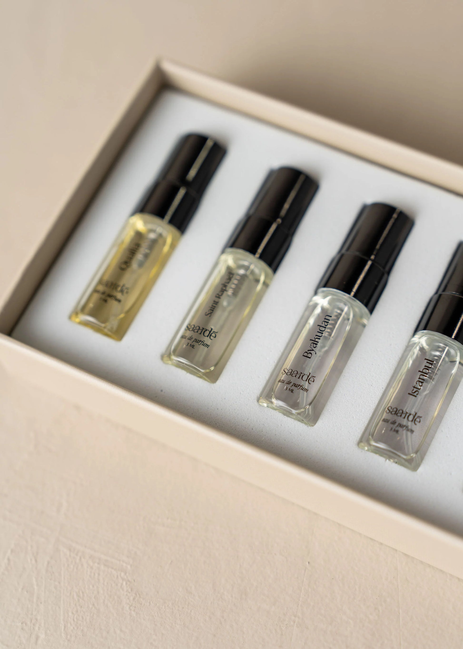 The Saardé Fragrance Discovery Set includes all of our Eau de Parfum scents— Saint Raphaël, Byakudan, Qualia and Istanbul.