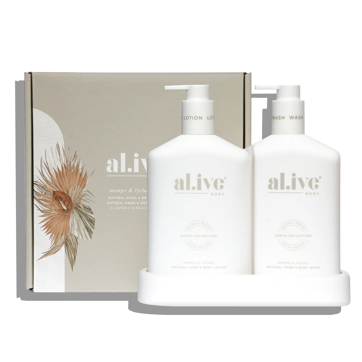 The al.ive body Wash & Lotion Duo in Mango & Lychee contains a luxurious blend of naturally derived ingredients, fortified with essential oils and native botanical extracts.